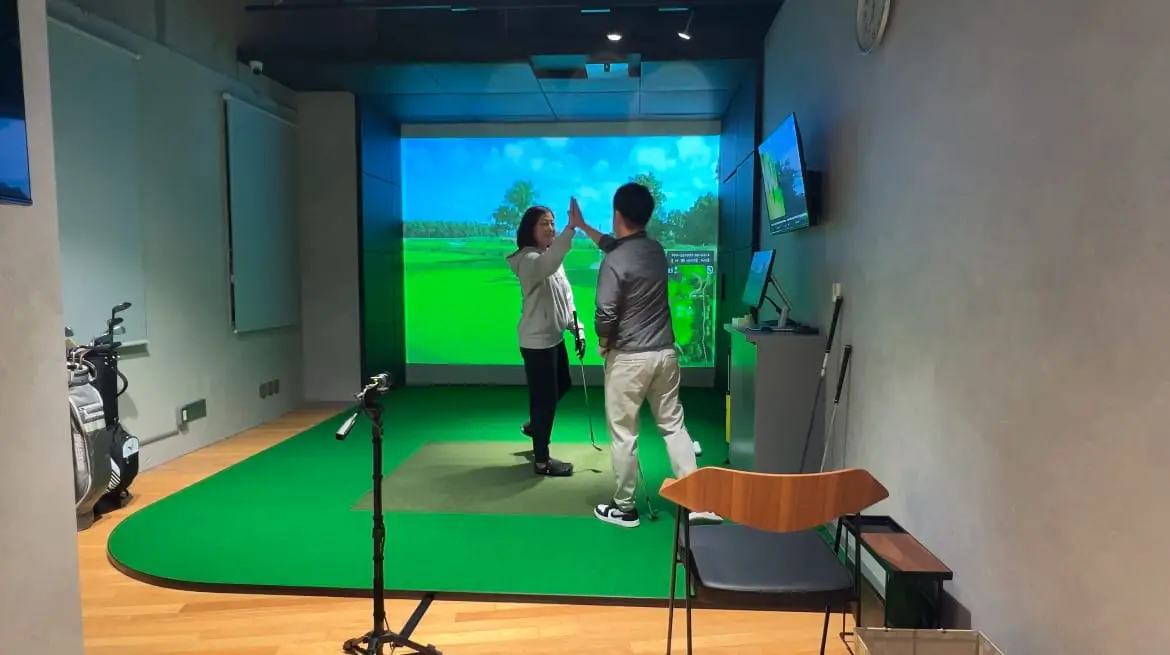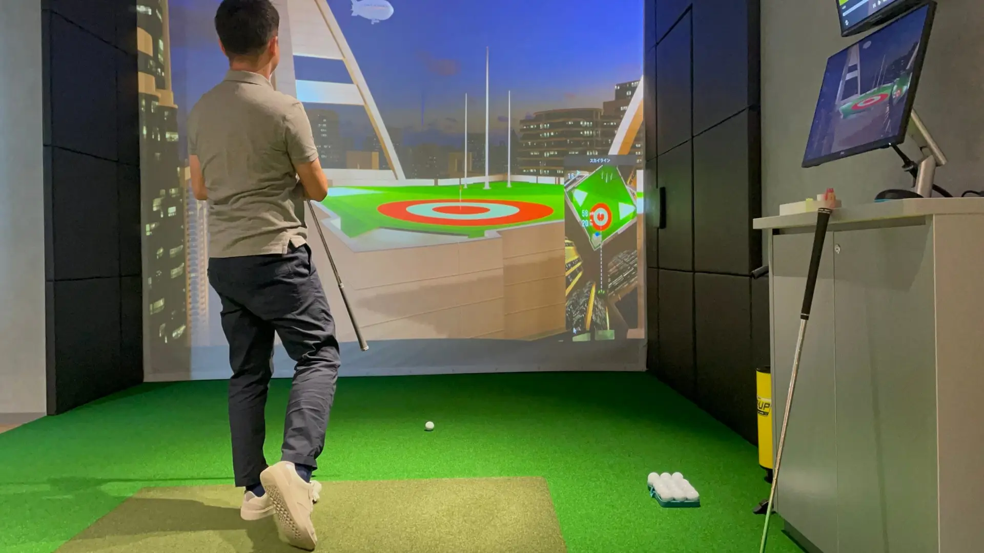 シュミレーションパター専用機もございます。こちらは、ご予約された方はどなたでもご利用頂けます。 パターの打ち出し角度や軌道など、ご自身の癖も見える化、チェックできます。 その他、ゲーム形式、対戦形式もありますので、様々お楽しみいただけます! *画像をクリックすると動画をご覧いただけます。